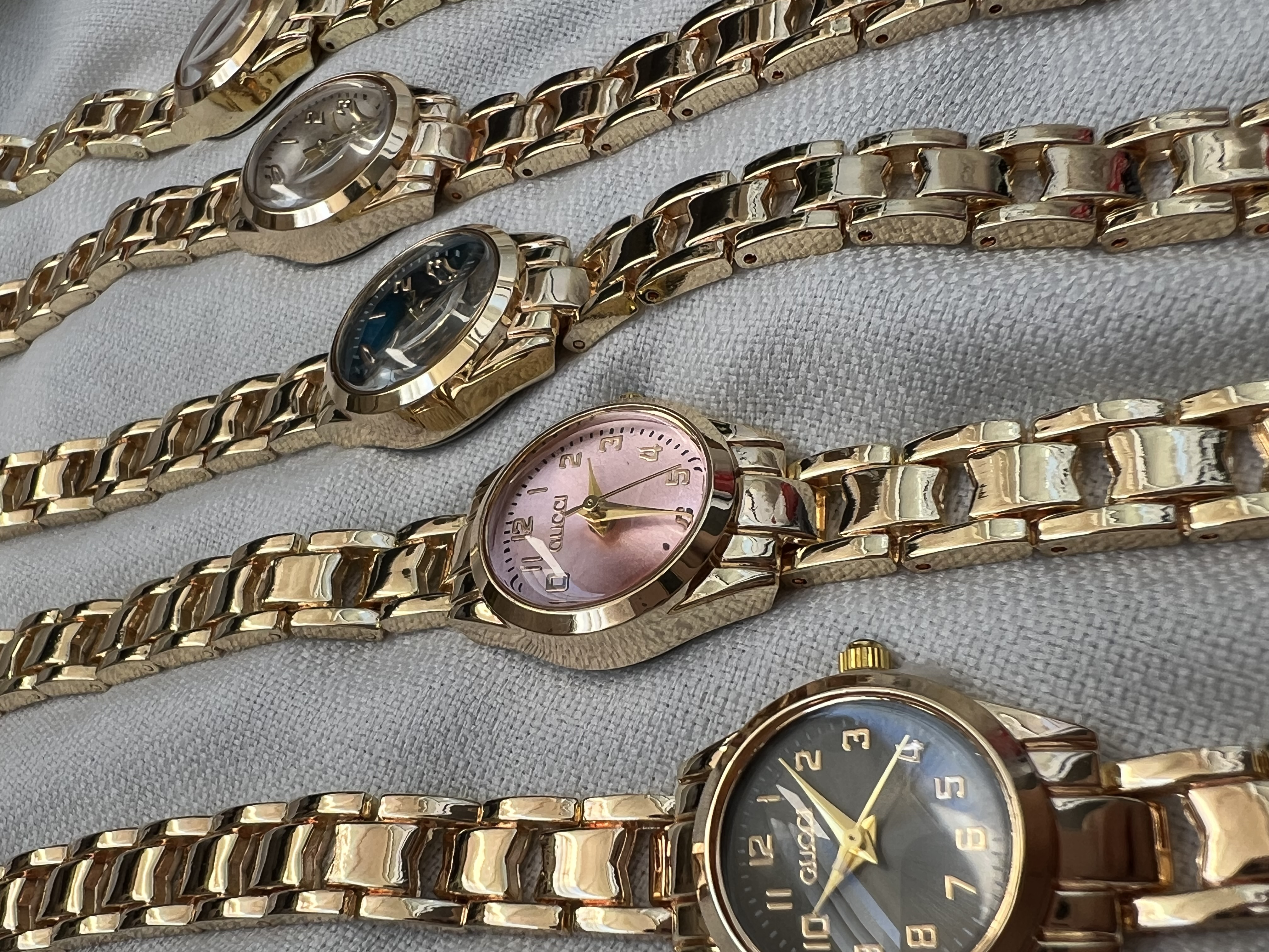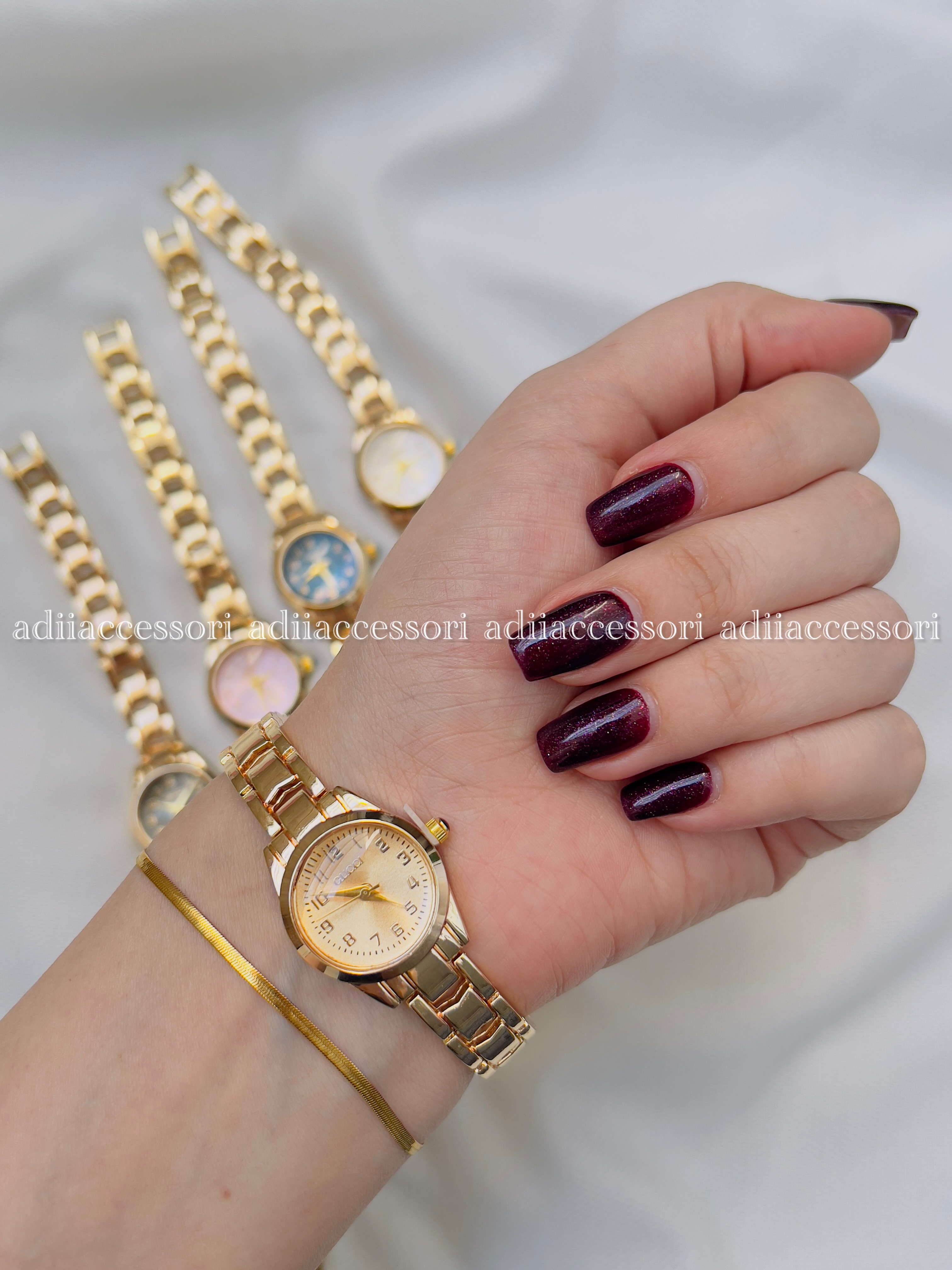 رنگ طلایی بند جلوهای لوکس و زنانه به ساعت داده و ترکیب آن با صفحهای رنگی (در رنگهای متنوع و جذاب) ظاهری مدرن و متفاوت ایجاد کرده است. این ساعت هم برای استفاده روزمره و هم برای مهمانیها و استایلهای رسمی مناسب است.